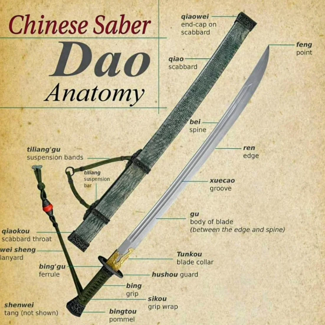 The Chinese sabre, or "Dao," features a distinct design optimized for battle. Key components of a typical Qing Dynasty Dao include: